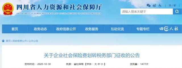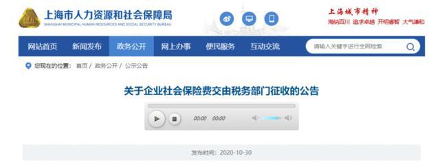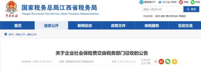 10月30日 北京、上海、山東、山西、湖南、四川、貴州、吉林、江西等地同時發(fā)布了《關(guān)于企業(yè)社會保險費(fèi)交由稅務(wù)部門征收的公告》的通知。