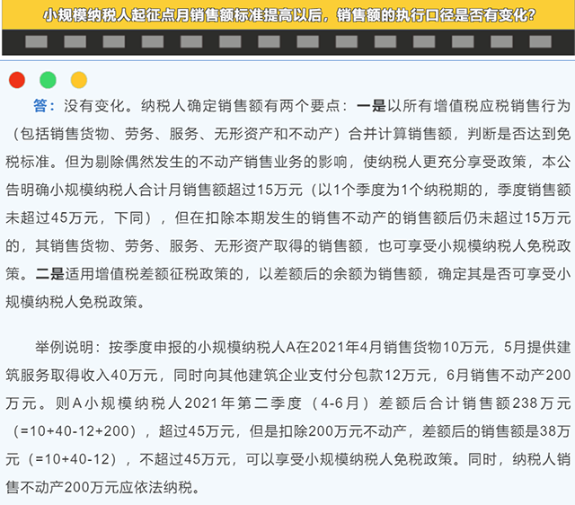 第一個(gè)問題:小規(guī)模納稅人起征點(diǎn)月銷售額標(biāo)準(zhǔn)提高以后,銷售額的執(zhí)行口徑是否有變化?